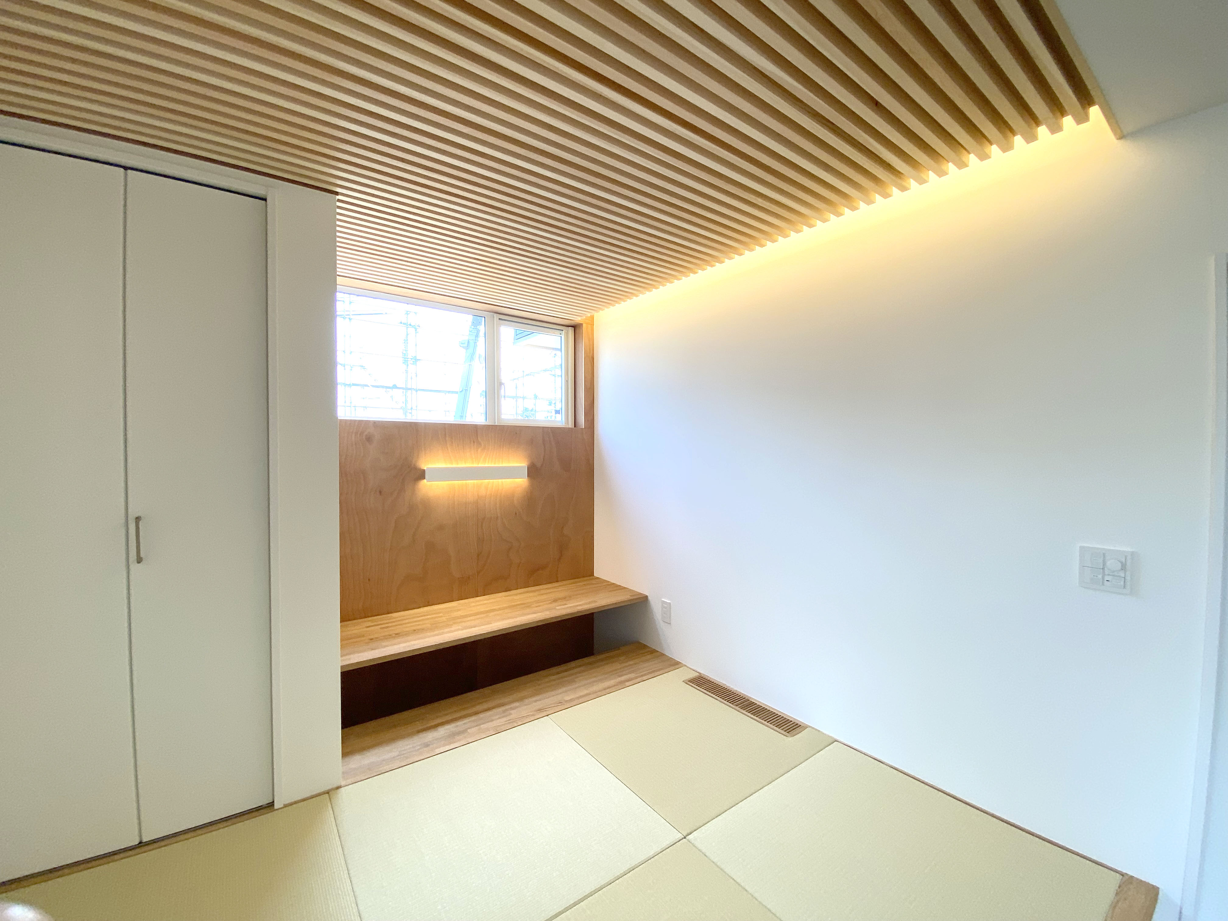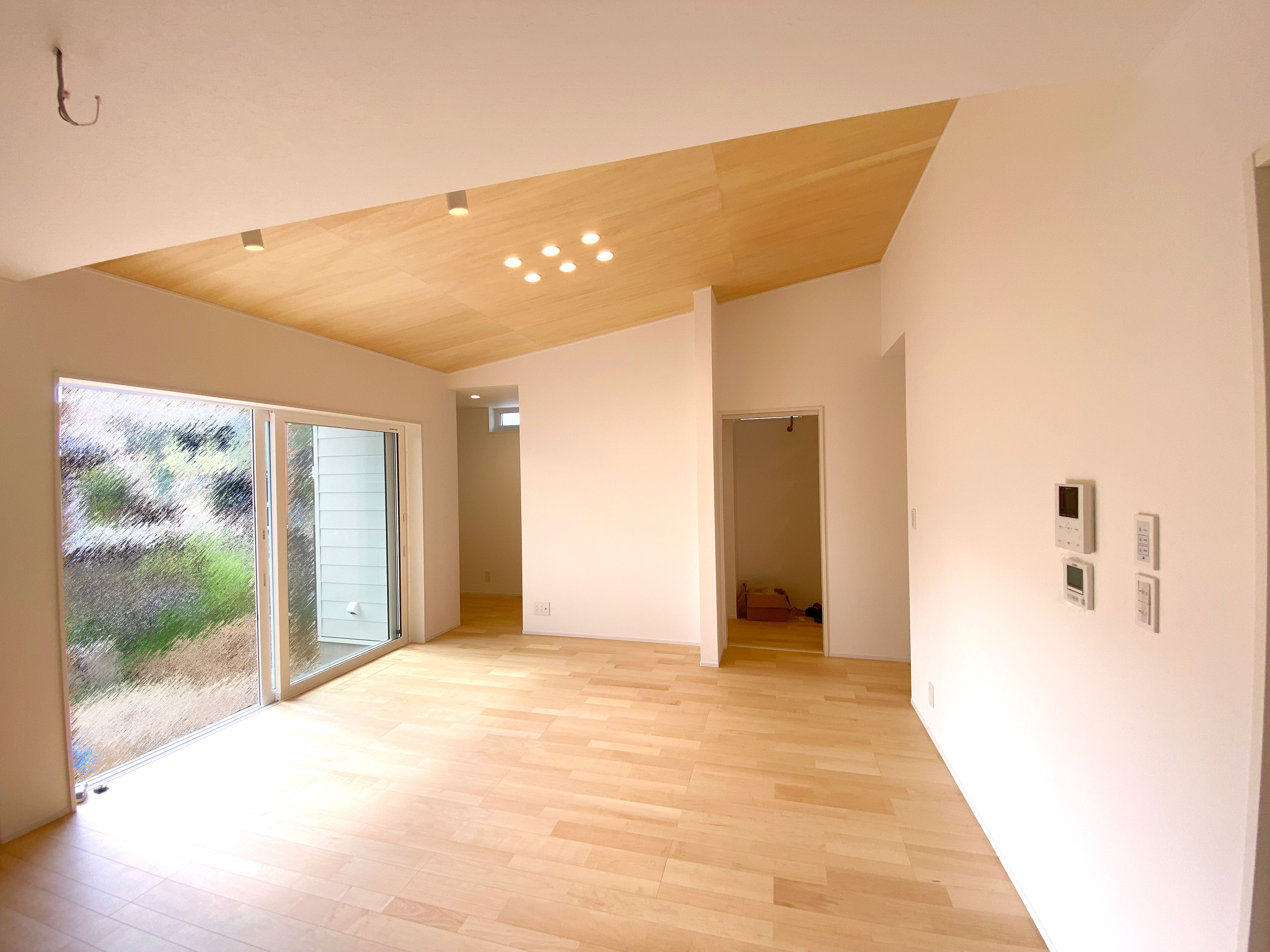 シナベニヤの天井です。流し方向を同じにすることで、和風にならずシンプルな仕上がりになりました。