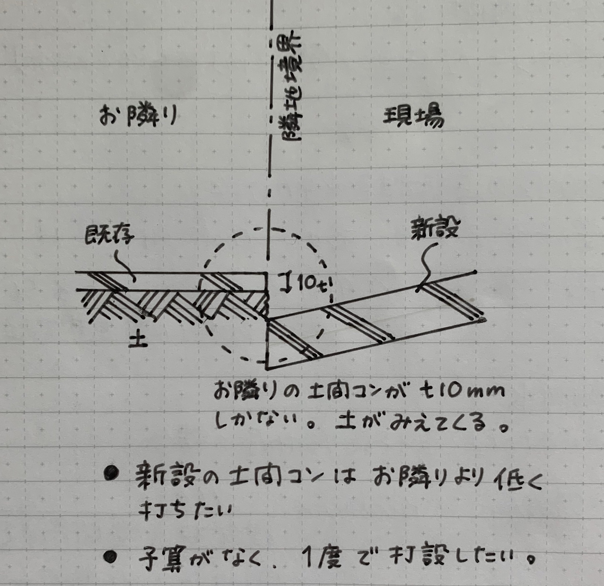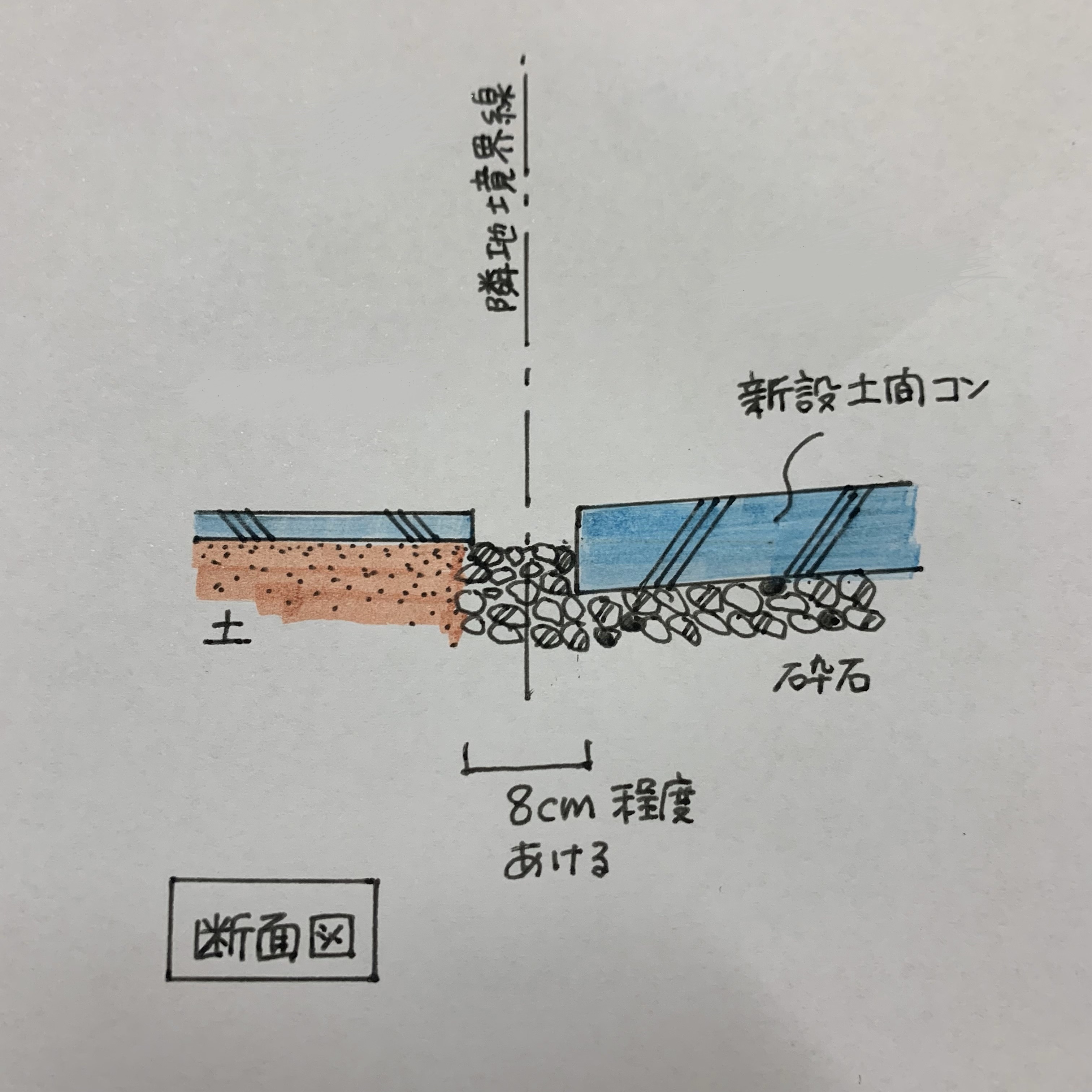 隣地境界線の土間コンをどうおさめようか、悩んでおりました。