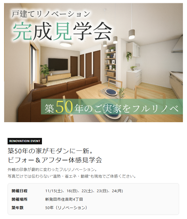 新発田市オープンハウス開催 2025/11/14 こんにちは。 今日は秋晴れですね! 今週末もお天気いいみたいですね。 明日から新発田市住吉町でオープンハウスを開催致します。 予約制です。ホームページよりご予約お待ちしております。 投稿者 工務部 中島美智子 ご要望を最大限に取り入れ、寄り添い、お客様それぞれに合ったお家造りを一緒に考えていきましょう。 最近の投稿 2025.11.14 新発田市オープンハウス開催 2025.10.31 ハロウィン! 2025.10.10 3連休の文化祭 2025.09.26 立仏のオープンハウスは日曜日まで