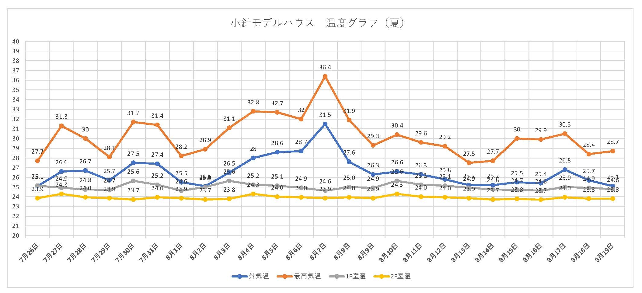 モデルハウスの温度グラフ 2017/08/31 家づくり情報 各モデルハウス共に、8月7日の外気温が36.4℃の猛暑日にも室内は安定した温度環境を保っています。 船戸山モデルハウス(温度).pdf 小針モデルハウス(温度).pdf エアコン一台で家中冷房できる仕組みをぜひモデルハウスにてご体感ください! 投稿者 営業部 関智哉 今まで培った知識と経験で、「失敗しないお家づくり」を全力でお手伝いいたします。 最近の投稿 2025.10.16 資金計画についてお気軽にご相談ください☺ 2025.09.18 来年度の補助金(新築) 2025.08.21 本日のモデルハウス室温です 2025.08.07 8月7日モデルハウス室温
