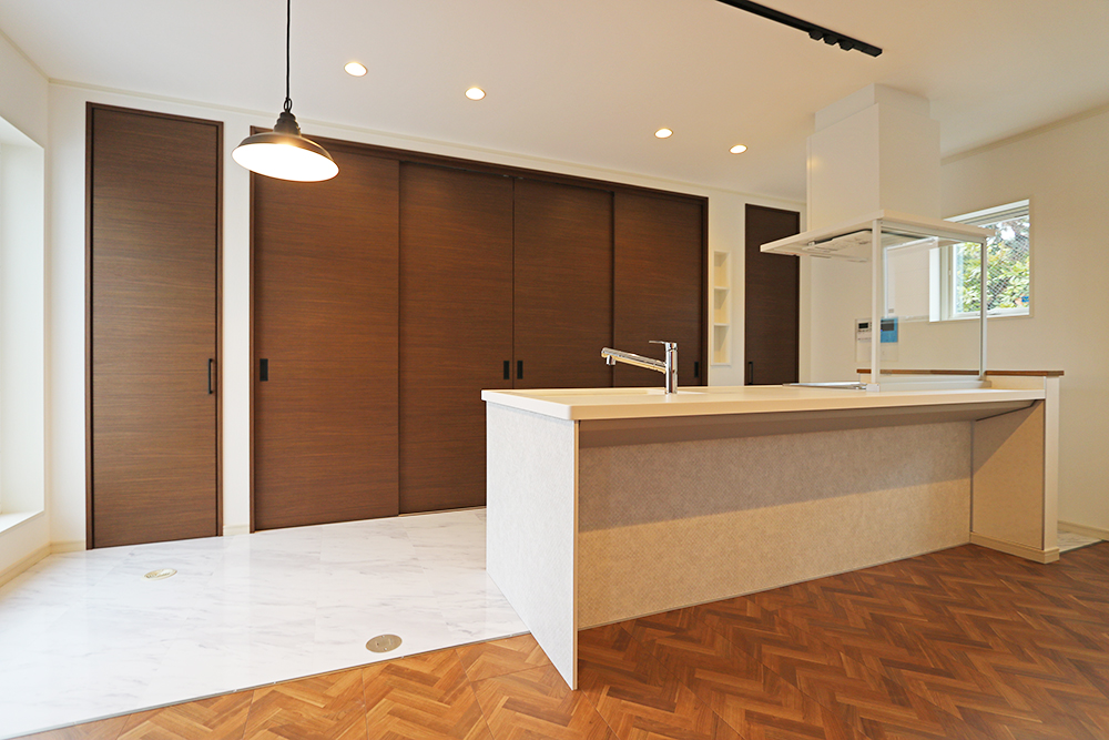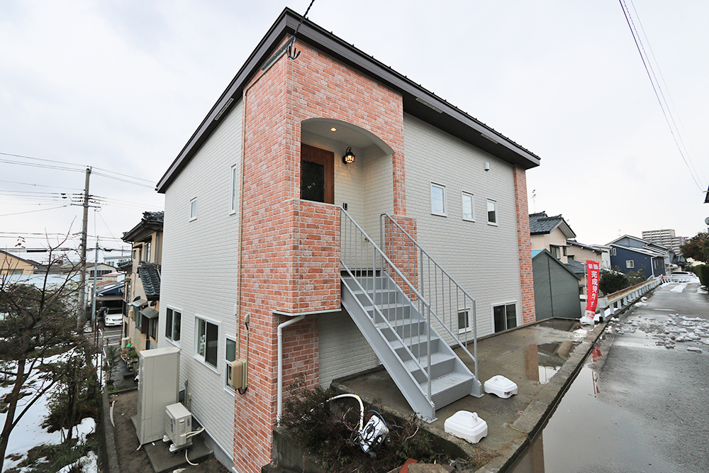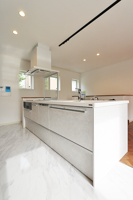 特殊な形状の敷地に建つ、2階リビングの住宅です。建物の随所にお施主様のこだわり、個性が光る素敵な建物に仕上がっています。性能面においても国土交通省の「サステナブル建築物等先導事業」の採択を受けUA値0.34、C値0.1という本物の「高気密高断熱」住宅になっています。