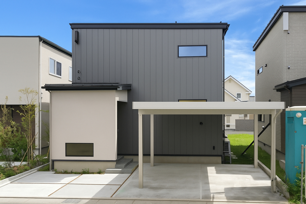 新築住宅 鳥原の家3 #カーポート#ニッチ 所在地- 耐震等級- 相当隙間面積(C値)0.1cm²/m² 外皮平均熱貫流率(UA値)0.31W/m²・K[HEAT20 G2] 再生可能エネルギーを除いた一次エネルギー消費削減率41% 再生可能エネルギーを加えた一次エネルギー消費削減率115%