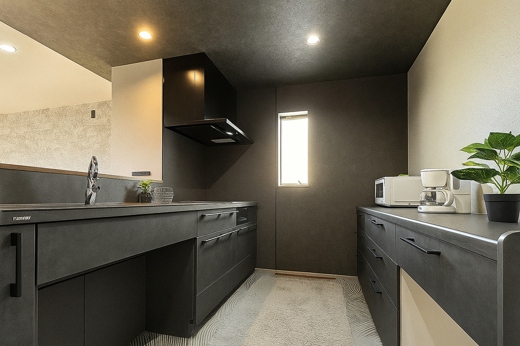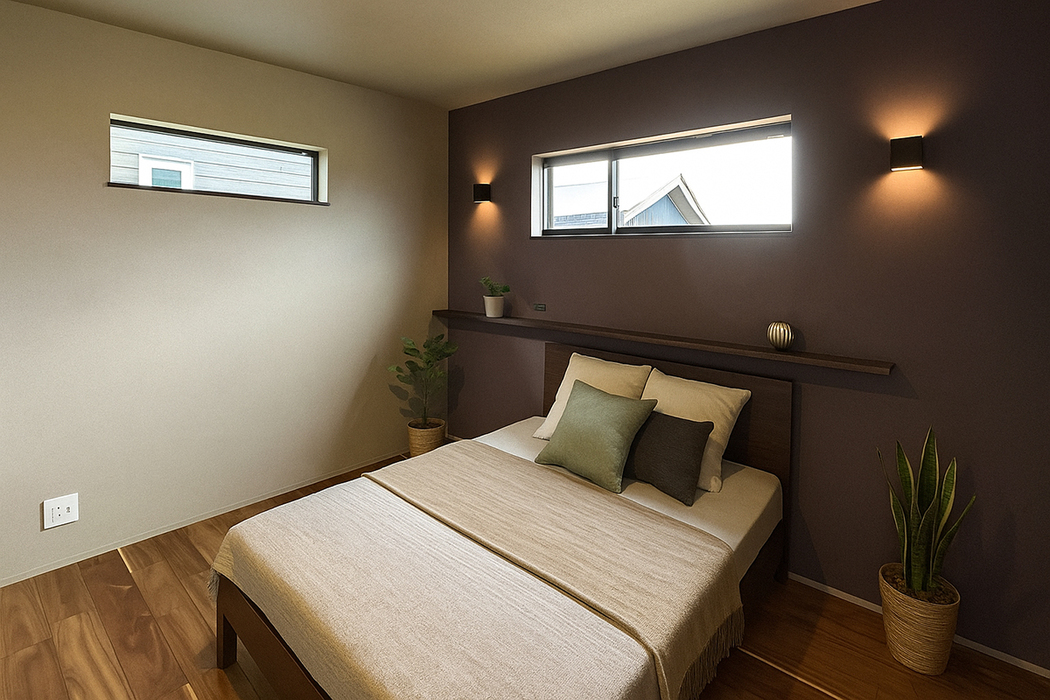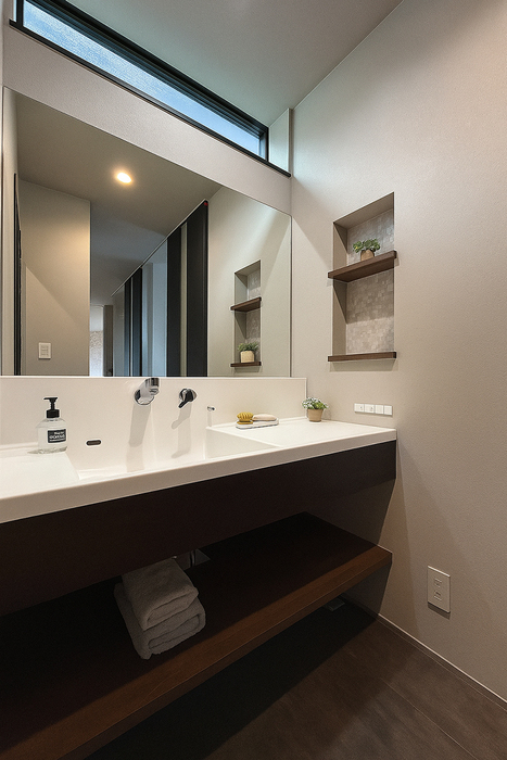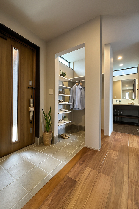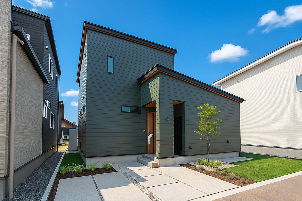 新築住宅 横越上町の家 所在地- 耐震等級- 相当隙間面積(C値)0.2cm²/m² 外皮平均熱貫流率(UA値)0.31W/m²・K 再生可能エネルギーを除いた一次エネルギー消費削減率35% 再生可能エネルギーを加えた一次エネルギー消費削減率93%