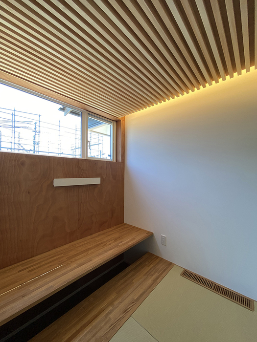 新築住宅 船戸山の家 #和室 所在地- 耐震等級- 相当隙間面積(C値)0.3cm²/m² 外皮平均熱貫流率(UA値)0.32W/m²・K 再生可能エネルギーを除いた一次エネルギー消費削減率40% 再生可能エネルギーを加えた一次エネルギー消費削減率-