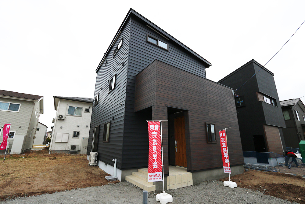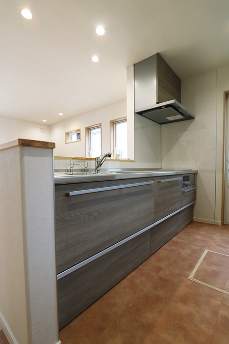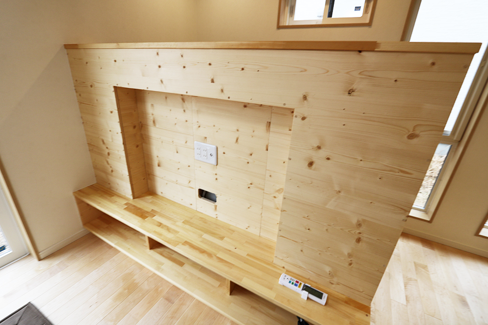 リビングには、桜の無垢フローリングを使用し、無垢材でTVボードを製作。